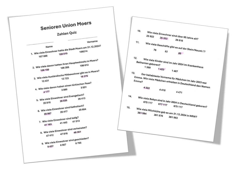 Zahlenquiz war am 09.10.2025 das Thema beim Stammtisch der Senioren Union im Café Pilatus. Dabei ging es um das Abschätzen von Einwohnerzahl, Konfessionsanteil, Migrationsanteil, Personenstand, beliebte Vornamen und anderes mehr.